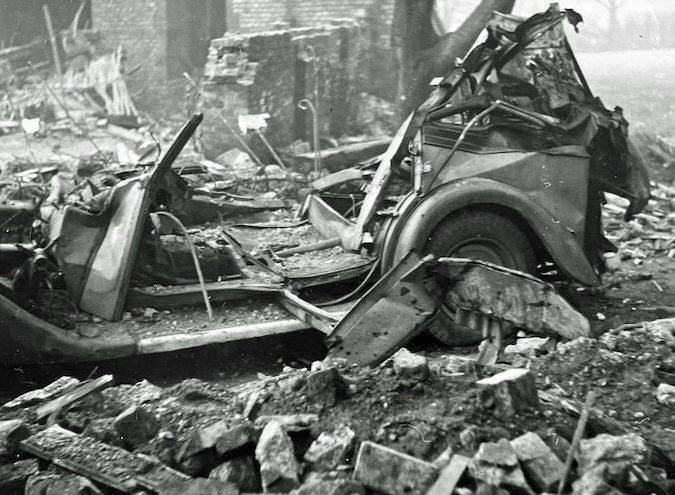 A wrecked vehicle near the house, certainly not the Lagonda of Bazley, (which had wired 19" wheels and different mudguards)